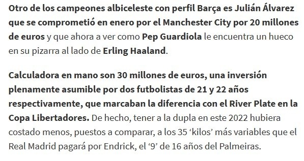 “Fichar tanto a Enzo Fernández como a Julián Álvarez de River Plate hubiera costado €30 millones el pasado mes de enero”, contóSport.Sin embargo, el Manchester City se adelantó a principios de año para quedarse con la ficha del Araña y dejándolo a préstamo hasta la finalización de la Libertadores, mientras que el mediocampista recién fue vendido a mediados de 2022 y a River le quedó un suculento 25% correspondiente a una futura venta. Dos operaciones magistrales que enriquecen al Millo.
