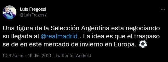 El periodista Luis Fregossi lo contó a través de su cuenta de Twitter. “Una figura de la Selección Argentina está negociando su llegada al Real Madrid. La idea es que el traspaso se dé en este mercado de invierno en Europa”, escribió. Y rápidamente despertó todo tipo de especulaciones.