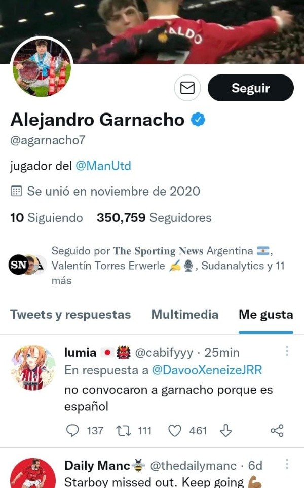 Sin embargo, las ganas de estar en una Copa del Mundo fueron notorias en el propio Garnacho, ya que en las redes expresó su disgusto por no formar parte del Seleccionado Nacional. “No convocaron a Garnacho porque es español“, soltó un usuario de Twitter como respuesta de un tuit del stream DavooXeneize, y sorpresivamente el futbolista del Manchester United le dio me gusta al mismo. ¿Querrá decir algo respecto a su futuro o solo se trata de un enojo por no estar en el Mundial?