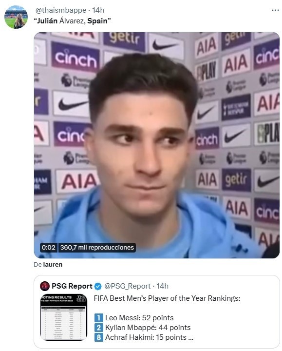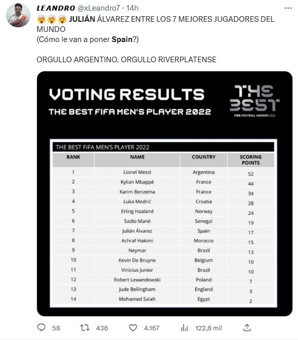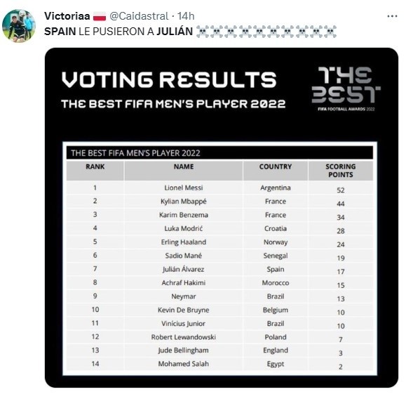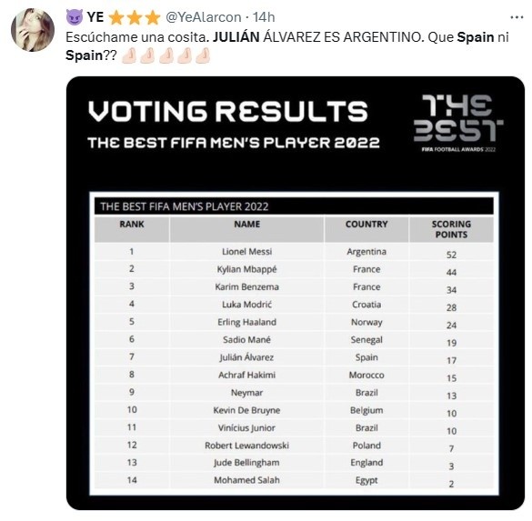 La información fue publicada por la propia FIFA, con la cantidad de votos que recibió cada jugador para definir al ganador del premio. Sin embargo, la difusión generó controversia en nuestro país a raíz de un insólito error con Julián Álvarez que los hinchas de la Albiceleste no perdonaron.
