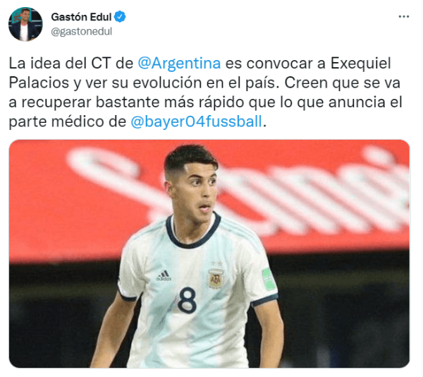 Para esta triple fecha, Scaloni deberá presentar la lista en los próximos días y quiere contar con un jugador en particular a pesar de haberse lesionado en los últimos días. Según informó Gastón Edul,la Selección intentará convencer al Bayer Leverkusen de ceder a Exequiel Palacios luego de confirmarse su lesión enel ligamento lateral del tobillo derecho.