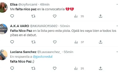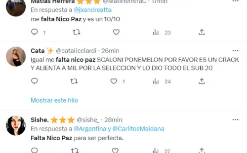 El ausente en cuestión es Nico Paz, el joven del Real Madrid que tuvo mucha participación en el Sudamericano Sub 20 de Javier Mascherano. El nacido enSanta Cruz de Tenerife se quedará en su club, ya que no fue citado por el DT. “Falta él”, fue lo que más reclamaron en las redes sociales.