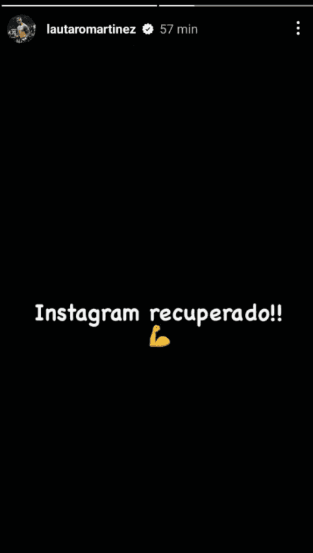 El runrún se estiró por varias horas y no fue hasta la madrugada en Argentina que se desmintió por completo. El surgido en Racing volvió a tomar las riendas de su cuentay lanzó un mensaje positivo luego de que su nombre apareciera en todas partes. “Instagram recuperado”, escribió Lautaro vía stories con un brazo arriba.