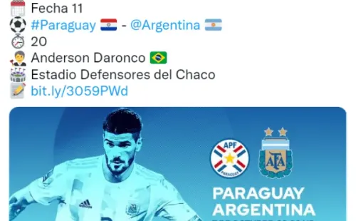 Con la modificación de último momento, Argentina saldrá al campo de juego en Asunción con Emiliano Martínez, Nahuel Molina, Cristian Romero, Nicolás Otamendi, Marcos Acuña; Ángel Di María, Rodrigo De Paul, Leandro Paredes, Giovani Lo Celso; Lionel Messi y Joaquín Correa. Mientras tanto, quienes quedaron fuera del banco de los suplentes fueronEsteban Andrada, Facundo Medina, Juan Foyth, Nicolás Domínguez, Emiliano Buendía, Ángel Correa y Lautaro Martínez.