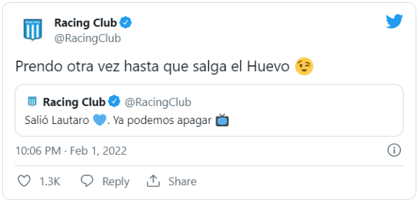 Los minutos pasaron y el tuit se empezó a viralizar. Por eso, del otro lado de la ciudad aprovecharon para contraatacar de la mejor manera. “Like si estás acostumbrado a ver los partidos hasta el final”, escribió el Rojo con una imagen de Dibu Martínez, producto de su semillero. Diabólico…