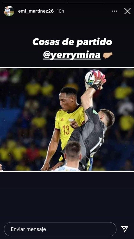 Minutos después del pitazo final de Roberto Tobar, el defensor de los tres palos apareció en su Instagram para brindar tranquilidad y le dedicó una historia al colombiano. Dibu subió la foto del momento en el que se produce su lesión y escribió “cosas del partido, Yerry”.