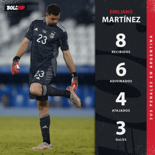 Sin embargo, su influencia no se limitó a lo hecho en el tiempo regular. Martínez mostró su gran talento en los penales, dónde acumuló unos números brutales. De los 8que le ejecutaron, adivinó 6y atajó 4. Solo Juan Guillermo Cuadrado, Miguel Borja y Yeferson Soteldo pudieron vencer al Dibu.Su nivel de élite expresado en los 90 minutos y en la tanda implicaron que Argentina avance de fase y conquiste su primer título oficial en el siglo: la Copa América. Mucho tuvo que ver el arquero en la conquista.