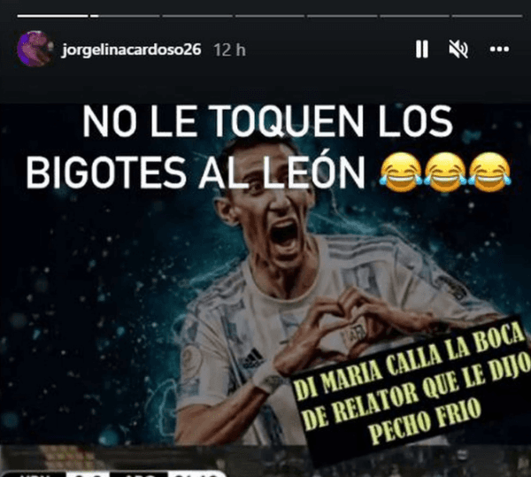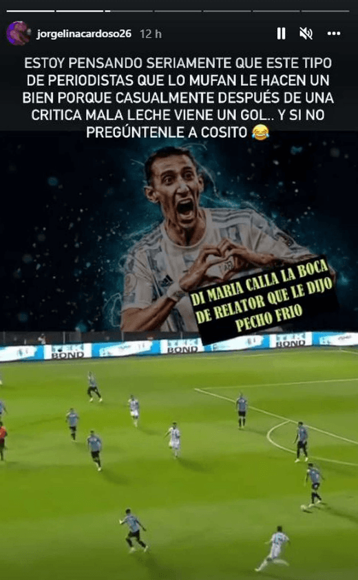Quién salió al cruce para defender a los futbolistas de la Albiceleste fue ni más ni menos que Jorgelina Cardoso, esposa de Fideo. Mediante unos fuertes posteos en su cuenta oficial de Instagram, la cónyuge de Di María no se calló nada a la hora de defender al único autor del gol de Argentina ante Uruguay.