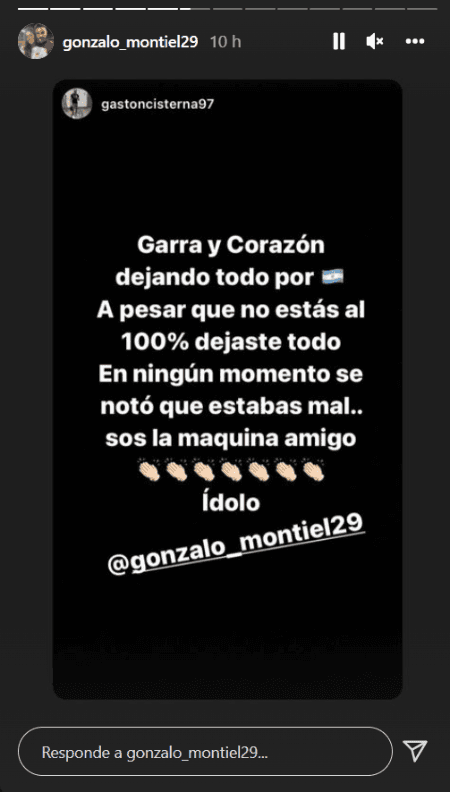 Tras el triunfo, Gonzalo Montiel reposteó un mensaje que deja entrever que no estaba en las mejores condiciones físicas. “A pesar de que no estabas al 100% dejaste todo. En ningún momento se notó que estabas mal”, decía la historia que compartió el ex-River.