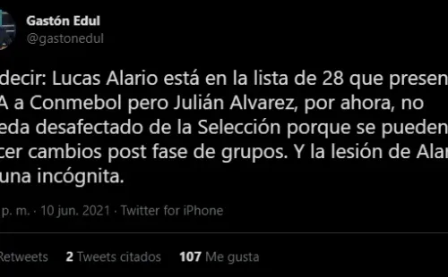 Pero, como explica Gastón Edul, Julián Álvarez sería el “jugador 29” de Scaloni, ya que “Julián Álvarez no queda relegado. Sigue entrenándose en el predio de AFA. Están especulando con el estado de Lucas Alario.Alario está en la lista de 28 que presentó AFA a Conmebol pero Julián Alvarez, por ahora, no queda desafectado de la Selección porque se pueden hacer cambios post fase de grupos. Y la lesión del delantero es una incógnita“.