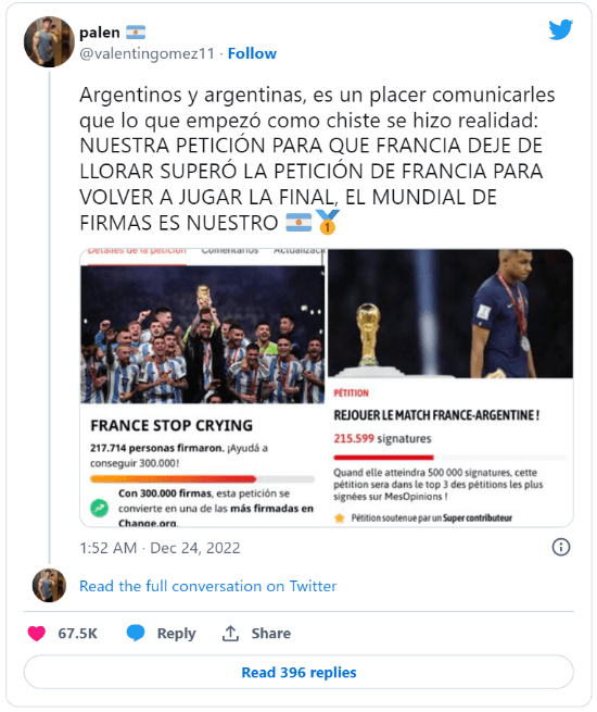 Anoticiados por esta insólita movida, Argentina lanzó otra petición: que Francia deje de llorar. Al cabo de unas horas, más de 350 mil personas se encargaron de firmarla para superar al pedido original. Una obra maestra.