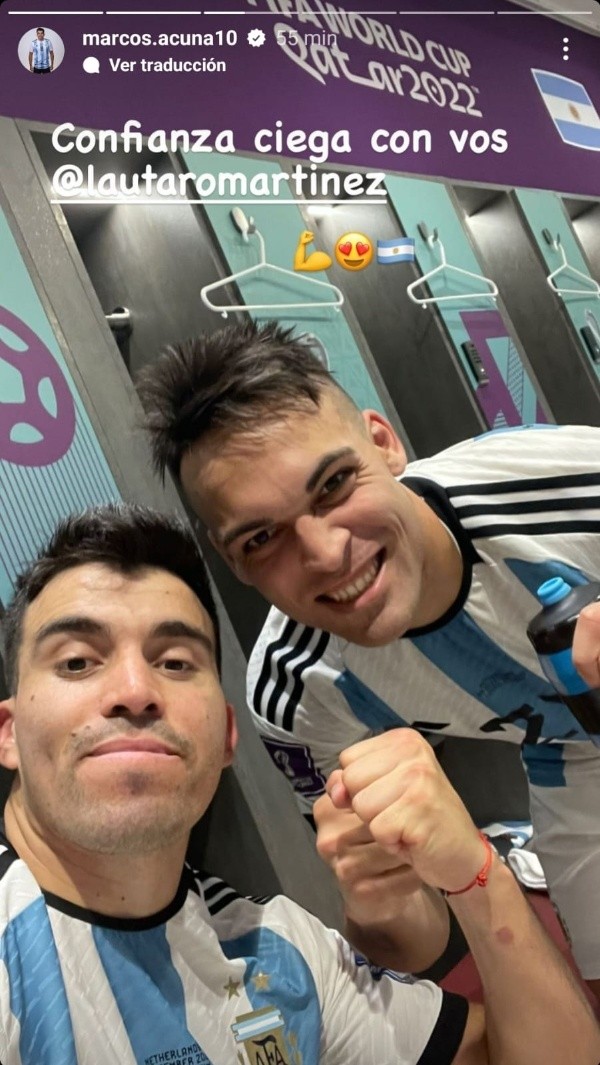 Acuña, al igual que todos los jugadores de la Selección Argentina celebraron la ajustadísima y sufrida clasificación a la semifinal del certamen mundialista. Pero tuvo tiempo para mostrarse en las redes sociales junto a Lautaro Martínez, con quien compartió plantel en la Academia.