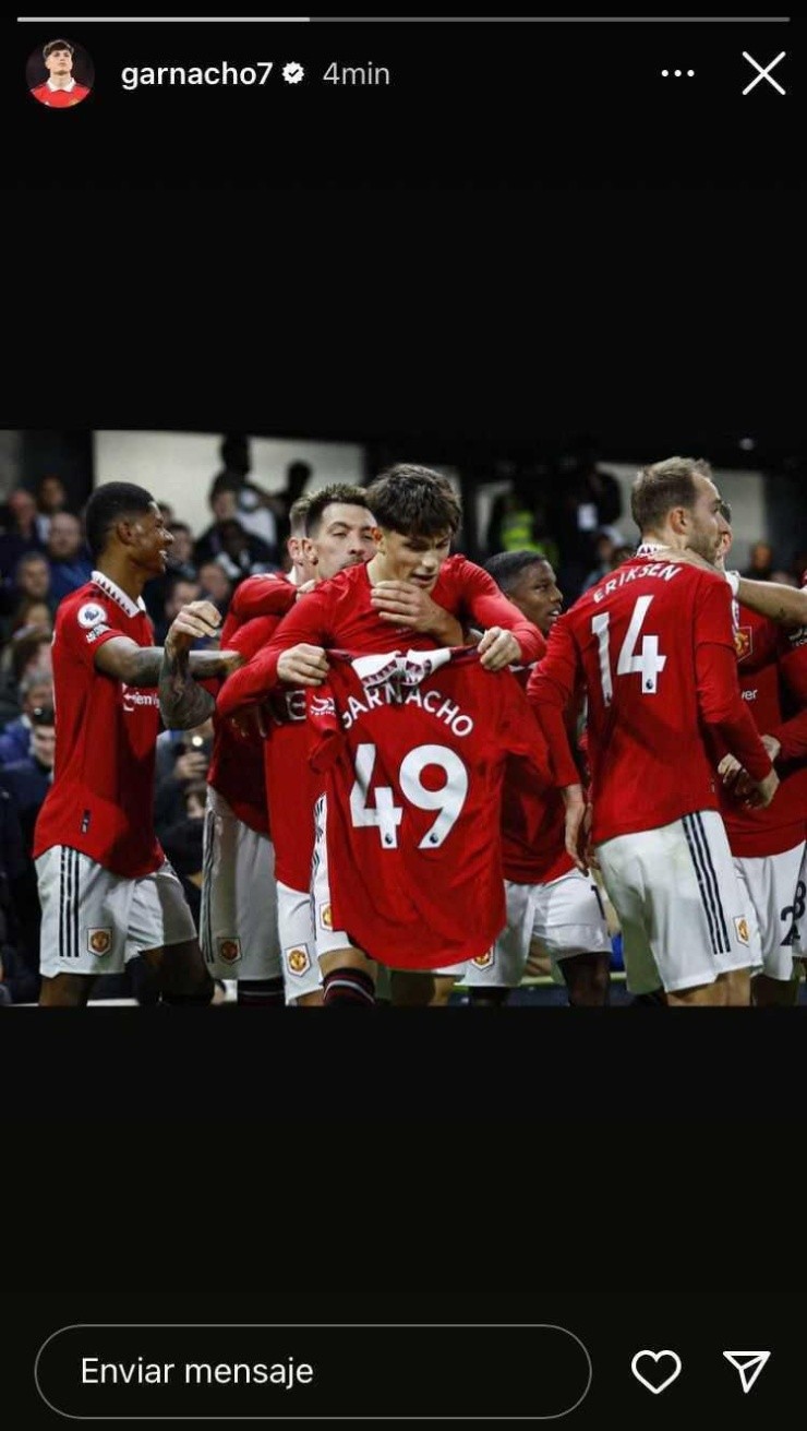 Tras el polémico like en Twitter que decía”No convocaron a Garnacho porque es español”, en unarespuesta de un tuit del stream DavooXeneize, el delantero de 18 años subió una foto a sus historias de Instagram, en la que está festejando el gol que hizo sobre la hora para ganarle al Fulham en la última fecha de la Premier League, emulando el festejo de Lionel Messi ante el Real Madrid en 2017 y casualmente detrás de el aparece Lisandro Martínez.