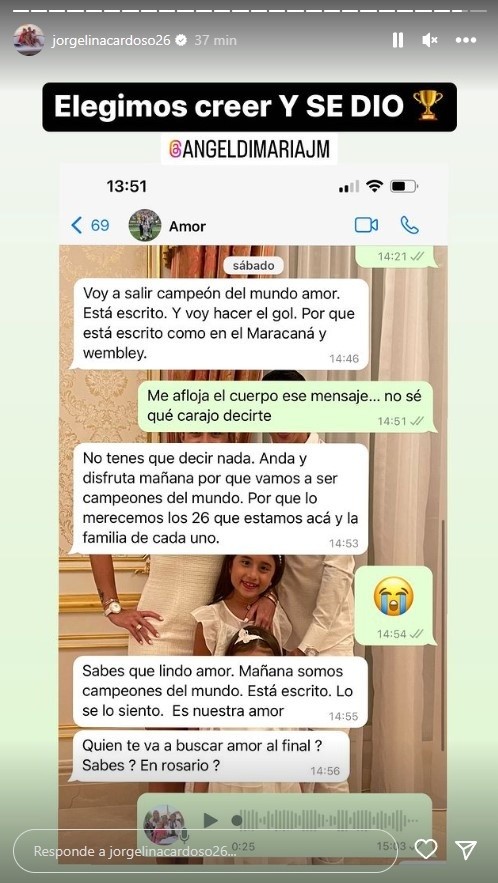 Como si se tratase de una repetición, lo mismo volvió a ocurrir en la previa a la final deQatar 2022entre Argentina y Francia. Con el resultado puesto, Cardoso volvió a difundir un chat privado a través de su cuenta de Instagram donde Ángel Di María asegura que la Albiceleste iba a ganar el trofeo más preciado.