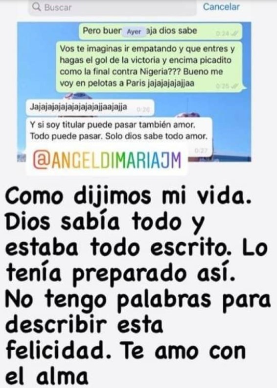 Hay que recordar que en la Copa América que consagró a la Albiceleste, Jorgelina Cardoso -esposa de Fideo- publicó una captura de chat de Whatsapp en donde habla con Angelito sobre lo que podría suceder en la final ante Brasil. Dicho y hecho, el crack de la Juventus la picó en el Maracaná y los de Scaloni dieron la vuelta.
