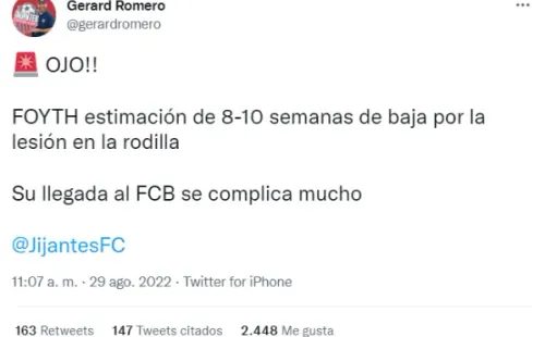 Según informó el periodista catalánGerard Romero, Foyth estará de baja entre 8 y 10 semanas en el Villarreal y está prácticamente caída la posibilidad de que llegue al FC Barcelona. En lo que incumbe al elenco campeón de América, Gastón Edul indicó que “no le dan los tiempos para la gira de la Selección Argentina”y que “no va a ser desafectado hasta el final para ver su evolución”.