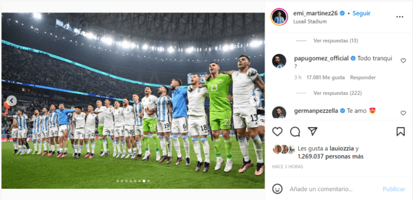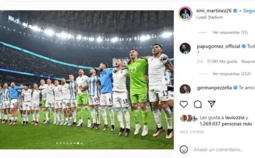 Fiel a su estilo, Alejandro Gómez no quiso pasar desapercibido y, con su cuenta de Instagram, se metió en uno de los posteos que realizó el arquero albiceleste, Emiliano Martínez. El golero, que también defiende los tres palos de Aston Villa, se mostró muy feliz por lo que logró junto a sus compañeros y sentenció: “Estamos en la final del mundo, falta un paso más”. Y allí fue que aprovechó el Papu.