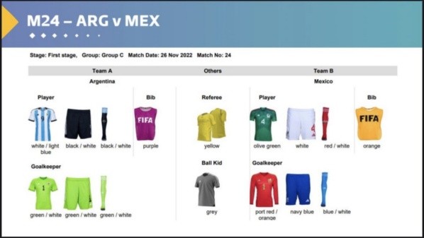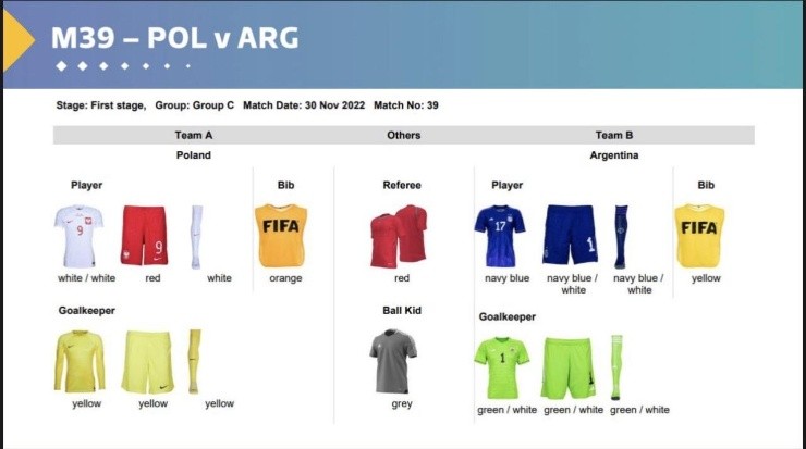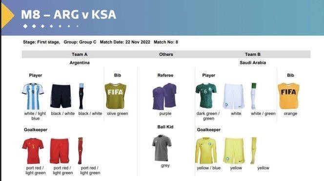 Buscando evitar que no haya ningún tipo de coincidencia en los partidos que se verán a lo largo y ancho del mundo, entre la FIFA y las selecciones ya acordaron cuál será la vestimenta de cada equipo en las tres fechas de la fase de grupo. Encuentros en donde los de Scaloni se enfrentarán a Arabia Saudita, México y Polonia.