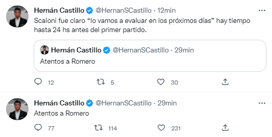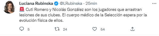 En línea con la información de los periodistas Hernán Castillo y Luciana Rubinska, la referencia de Scaloni sería por los estados físicos de Cristian “Cuti” Romero y Nicolás González, dos de los que quedaron afuera del amistoso contra EAU por arrastrar molestias desde hace algunas semanas. Se vienen días clave para definir la lista y el DT no quiere volver a lamentar otra baja sensible.