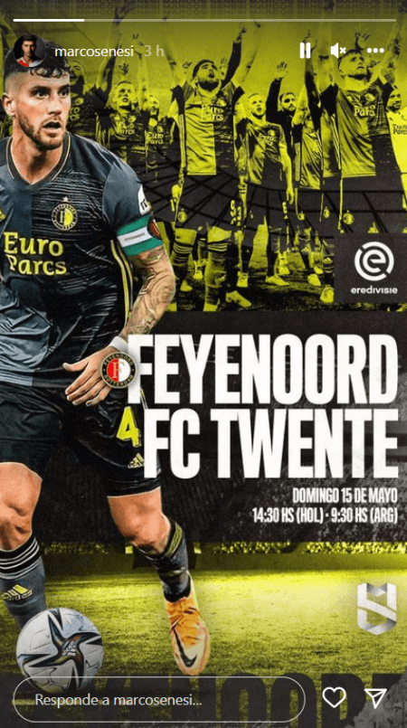 La primera historia que subió el zurdo a Instagram tuvo muy poco que ver con Argentina e Italia. El jugador posteó una gráfica anunciando el horario en el que jugará mañana con su Feyenoord ante el Twente por la Eredivisie.