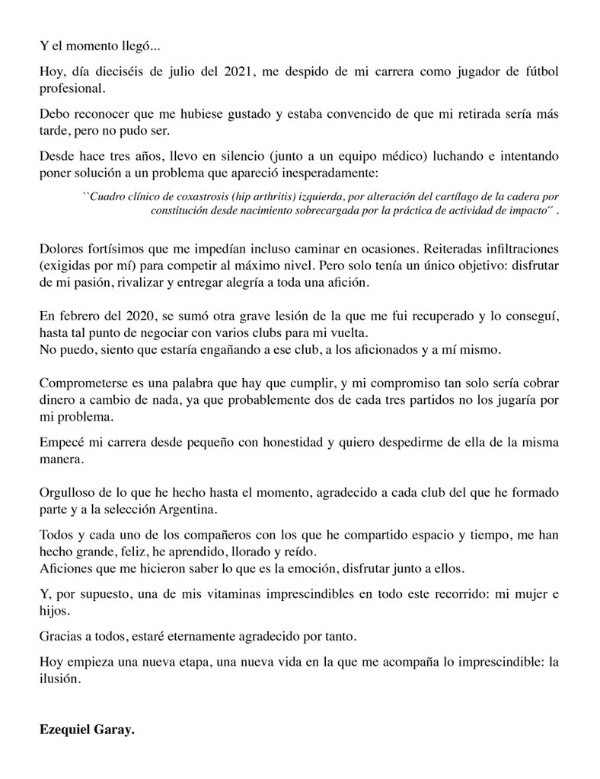 + La carta de despedida de Ezequiel Garay: