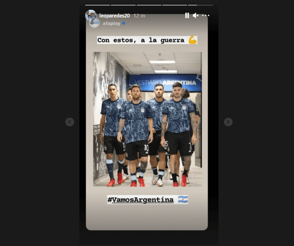 “Con estos, a la guerra. Vamos Argentina”, exteriorizó el volante de Paris Saint-Germain por intermedio de las redes sociales, acompañando dicha frase con una fotografía en la que se lo puede ver junto a sus compañeros de la Albiceleste.