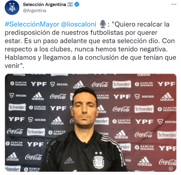 En adición, el DT volvió a destacar la postura de los futbolistas de la Selección y lo relacionó al gen argentino:“Desde que formo parte de las Selecciones Nacionales siempre he visto la misma predisposición. Si hay algo que caracteriza al jugador argentino es querer estar en la Selección”.