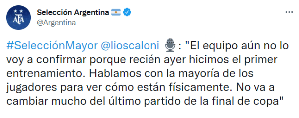 El entrenador de la Selección brindó una conferencia de prensa a un día del partido entre Argentina y Venezuela, en la cual no confirmó el equipo pero sí dio pistas.“El equipo aún no lo voy a confirmar porque recién ayer hicimos el primer entrenamiento. Hablamos con la mayoría de los jugadores para ver cómo están físicamente. No va a cambiar mucho del último partido de la final de copa”, sentenció el DT ante los medios de comunicación.