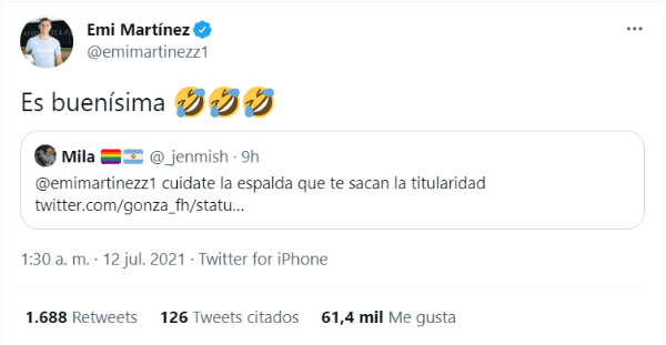 Fue el propio ‘Dibu’ quien en Twitter, se volvió loco con una imitación de un fanático que en plena Avenida, se puso a atajar y luego festejar como el propio futbolista lo hizo en esas semifinales.