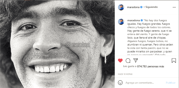 El Instagram de Diego Armando Maradona estuvo totalmente inactivo desde su partida física de este mundo el 25 de noviembre del 2020, una fecha que los futboleros no queremos recordar con frecuencia. Esto, hasta hoy, donde reapareció con una publicación hecha de parte de sus hijos, quienes afirmaron que mantendrán la cuenta activa para que “su fuego inigualable no se apague nunca”, como si eso fuese posible.