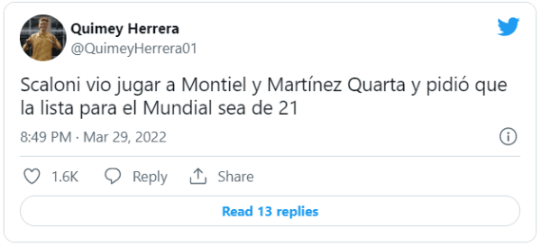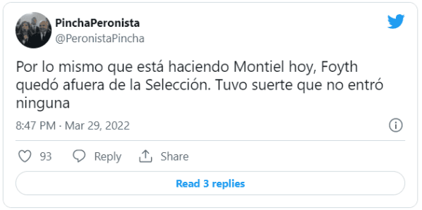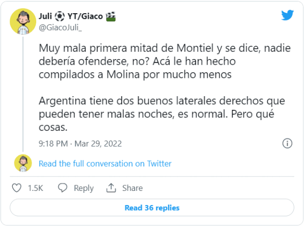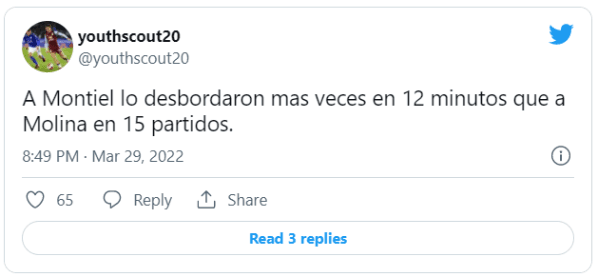 Más allá de los cuestionamientos para el ex-River, la propia cuenta de la Selección Argentina lo destacó por haber sido el futbolista del equipo con más recuperaciones a lo largo de los 90 minutos. Está claro que tanto con Montiel como con Molina eincluso con Foyth, el puesto está bien cubierto.