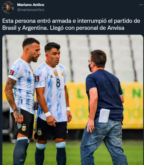“Esta persona entró armada e interrumpió el partido de Brasil y Argentina. Llegó con personal de Anvisa”, exteriorizó Antico por intermedio de las redes sociales. Sin lugar a dudas, un hecho que, si se confirma, tiene una gravedad impactante.