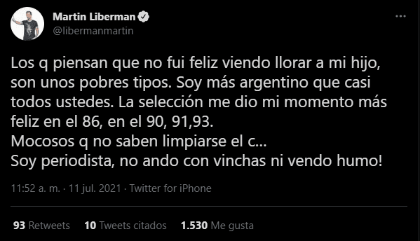 El foco de esto estuvo en el periodista Martín Liberman, quien rápidamente salio al cruce en su Twitter personal: “Los que piensan que no fui feliz viendo llorar a mi hijo, son unos pobres tipos. Soy más argentino que casi todos ustedes“.