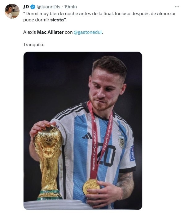 Derribando los mitos de la presión incesante antes de jugar una final, el crack de Mac Allister aseguró:“Dormí muy bien la noche antes de la final. Incluso después de almorzar pude dormir siesta”. Un temple bárbaro, sobre todo teniendo en cuenta que el mediocampista fue uno de los puntos altos de Argentina y hasta asistió a Di María en el 2-0. Un tipazo.