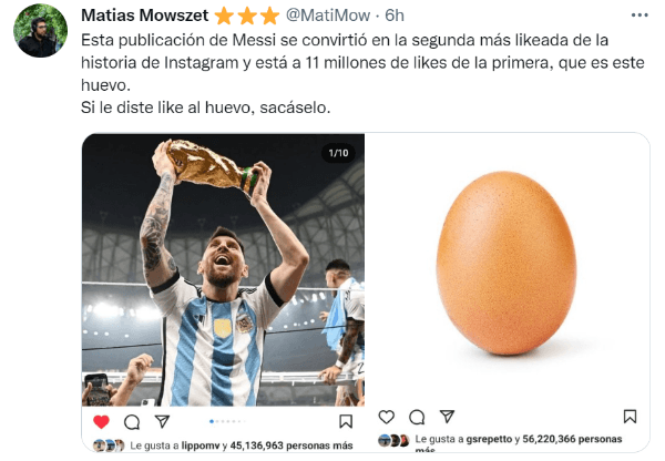 En las últimas horas, el periodista Matías Mowszet compartió un posteo en sus redes sociales en donde mostró la publicación que realizó el 10 de la Selección Argentina tras coronarse en Medio Oriente y a su lado la imagen que mayor cantidad de likes posee en Instagram. Lo llamativo de todo esto es que se trata de ¡un huevo! Sí, como se lee. Un simple huevo alcanzó el récord de ‘me gusta’, con un total de 56.220.367, mientras que la del capitán argento tenía 11 millones menos.