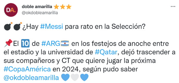 Claro que la palabra del entrenador abrió una puerta a la esperanza de que el mejor futbolista del mundo pueda seguir ligado a la celeste y blanca. Pero todo dependerá de lo que decida hacer el ex FC Barcelona. Y en las últimas horas, desde Doble Amarilla afirmaron que“el 10 de Argentina en los festejos de anoche entre el estadio y la universidad de Qatar, dejó trascender a sus compañeros y cuerpo técnicoque quiere jugar la próxima Copa América en 2024”. ¿Será?