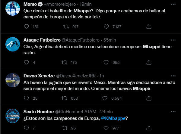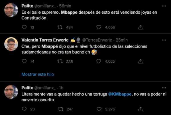 Lógicamente, tras la obtención de un nuevo título para la Selección dirigida por Lionel Scaloni, siendo esta vez ante un rival europeo, en las redes sociales se acordaron de los dichos del futbolista del PSG y lo hicieron tendencia en redes, sobre todo en Twitter, plagando la red del pajarito con memes y chistes dirigidos a Mbappé.