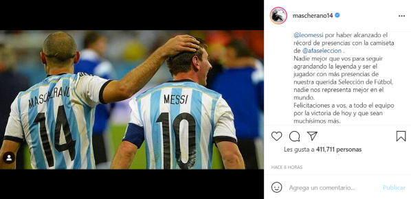 “Orgulloso por haber podido vestir la celeste y blanca tantas veces como mi amigo Masche al cual quiero mucho, respeté y admiré siempre”, posteó Leo minutos después del pitazo final del árbitro del duelo ante Paraguay. Dos gigantes de nuestra historia.