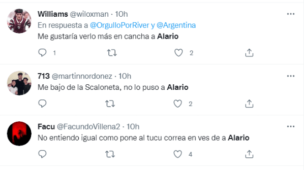Sin embargo, muchos futbolistas se jugarán su boleto al próximo Mundial de aquí a un año. Casos como los laterales del equipo y algunos suplentes dislumbran lo que será una feroz batalla para poder sumarse al grupo de Qatar. Los hinchas también tienen a sus favoritos y anoche se hicieron oír: a pesar de no haber disputado ni un solo minuto en esta gira, Lucas Alario fue tendencia hasta después del Argentina-Perú, gracias al pedido de algunos simpatizantes de la Albiceleste para que ingresara a la cancha.