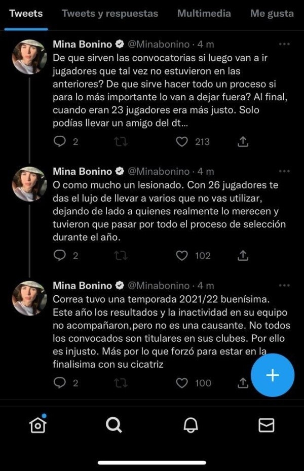 Así como dio salto a la fama, también supo aprovecharla para tener diversas opiniones en contra de la Selección Argentina, aunque a quien más veces le disparó fue al actual entrenador campeón del mundo, Lionel Scaloni:“¿De qué sirven las convocatorias si luego van a ir jugadores que tal vez no estuvieron en las anteriores? ¿De qué sirve hacer todo un proceso si para lo más importante lo van a dejar afuera? Al final, cuando eran 23 era más justo, sólo podías llevar a un amigo del DT…”, lanzó en Twitter cuando se dio a conocer la lista de futbolistas que viajarían hacia Qatar para disputar la competencia mundialista.