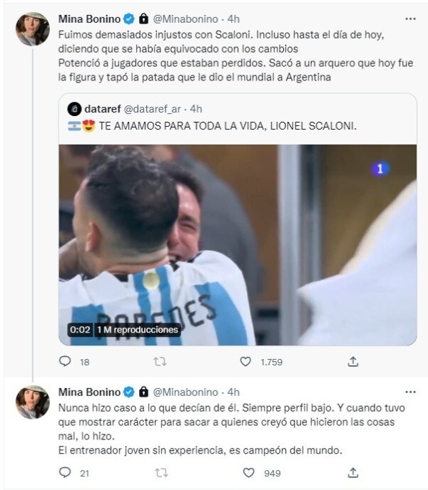 Si bien nunca mencionó directamente a quién iban dirigidas sus palabras, se sobrentiende que eran especialmente para aquellos que criticaron al seleccionado argentino, como así también a su cuerpo técnico. “Nunca hizo caso a lo que decían de él. Siempre perfil bajo. Y cuando tuvo que mostrar carácter para a quienes creyó que hicieron las cosas mal, lo hizo. El entrenador joven sin experiencia, es campeón del mundo”, completó.