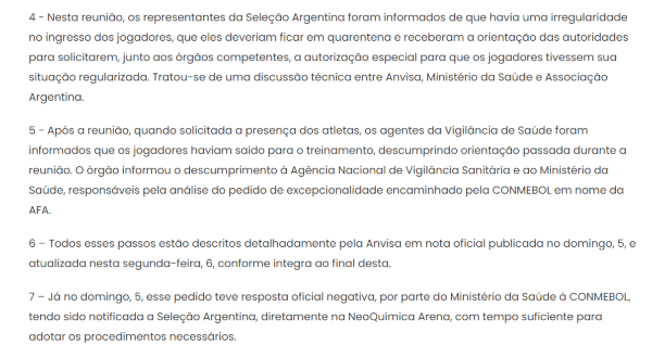 4 – En esta reunión, los representantes de la Selección Argentina fueron informados que existía una irregularidad en el ingreso de jugadores, que debían ser puestos en cuarentena y recibieron orientación de las autoridades para solicitar, ante los órganos competentes, autorización especial para los jugadores. regularizar su situación. Fue una discusión técnica entre Anvisa, el Ministerio de Salud y la Asociación Argentina.