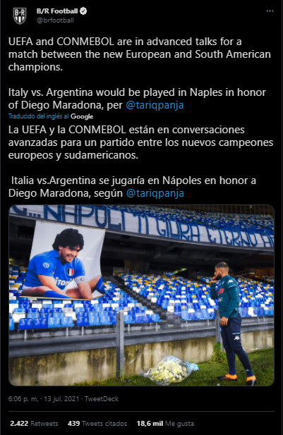 Según informó BR Sports, “La UEFA y la CONMEBOL están en conversaciones avanzadas para un partido entre los nuevos campeones europeos y sudamericanos.Italia vs Argentina se jugaría en Nápoles en honor a Diego Maradona“, por lo que, lo que se pidió en las redes sociales durante todo el fin de semana de fiesta, está cerca de cumplirse.