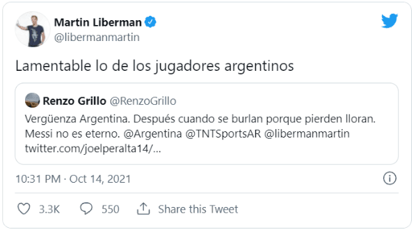 Además, Liberman se indignó por cómo algunos bancaron el gesto de los zagueros: “¡Y la gente lo festeja! Insólito”. Pasando al partido, en elanálisis quesubió a su canal de YouTube, el periodista reconoció que “Argentina fue más y tuvo el control del partido”.