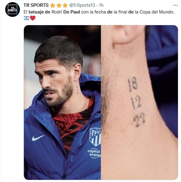 Rodrigo De Paulpasó por la sala de tattoo y, a diferencia de varios compañeros de selección que optaron por dibujarse la pierna o el brazo, el volante del Atlético Madrid lució su homenaje al Mundial de Qatar en su cuello.