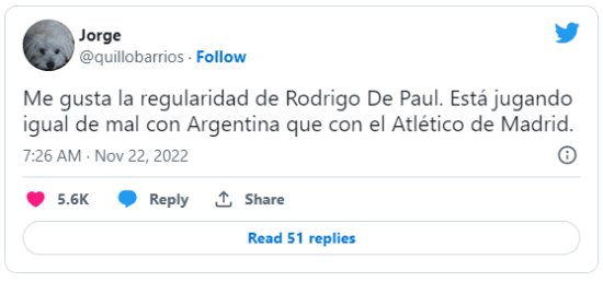 Se trata de Rodrigo De Paul, que fue el más impreciso de los argentinos en la etapa inicial y no pudo hacerse importante en el complemento con el resultado adverso. El volante, que viene de un flojo semestre en el Atlético Madrid, no se salvó de las críticas.