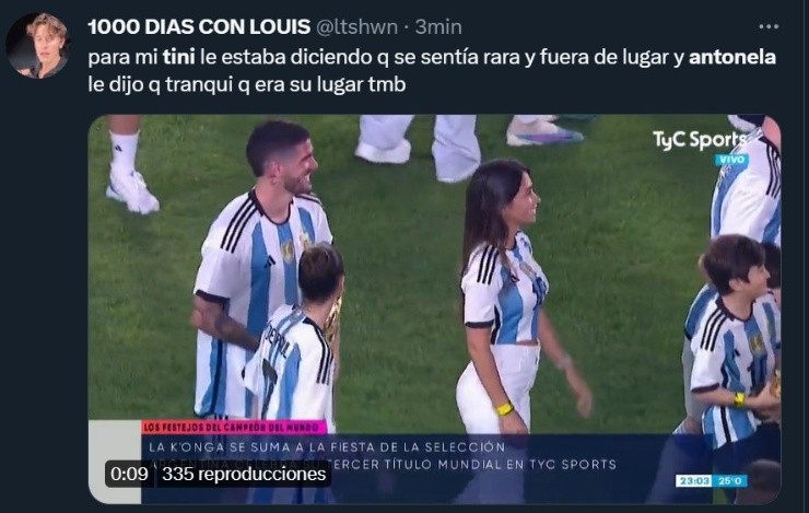 A través de las redes sociales, una vez que se viralizó el video, los hinchas de la Selección Argentina comenzaron a interactuar y sacaron conjeturas de lo que pudo haber sido el diálogo entre la cantante y la esposa del capitán, Lionel Andrés Messi Cuccittini. Sin embargo, se puede observar como la rosarina le expresa a Tini que “éste es tu lugar”, haciendo referencia al campo de juego. ¿Será que la novia de De Paul no se sentía cómoda?