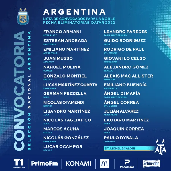 Para enfrentar a Chile y Colombia, el director técnico argentino metió en la nómina algunas sorpresas. Entre ellas, los regresos de Paulo Dybala, Lucas Ocampos, Esteban Andrada,Emiliano Buendía y Alexis MacAllister. Pero también hubo bajas importantes y nuevos convocados.
