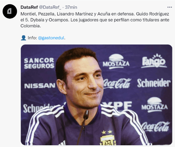 Con todas las opciones mencionadas, Scaloni colocaría a Dibu Martínez; Montiel, Pezzella, Lisandro Martínez, Acuña; Guido Rodríguez; Ocampos, Lo Celso,Nicolás González; Dybala y Lautaro Martínez.