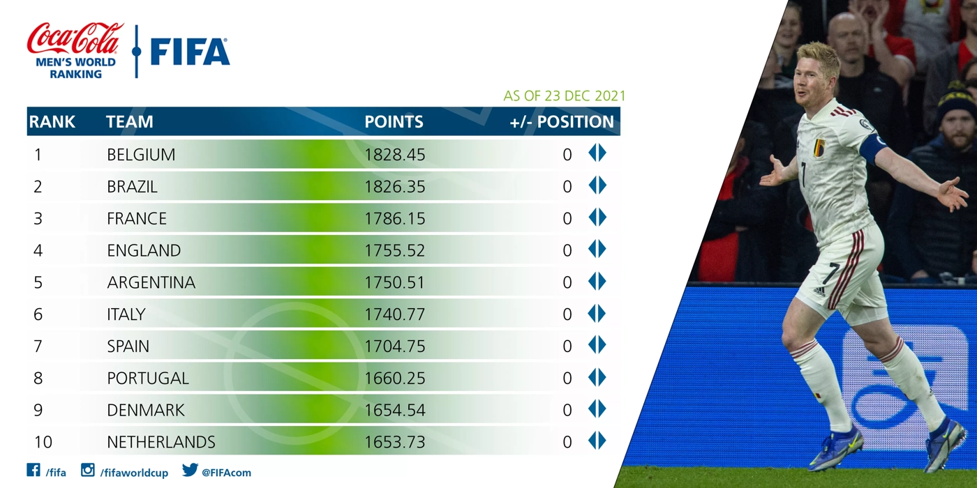 Teniendo en cuenta los resultados del conjunto dirigido por Scaloni resulta al menos curioso observar que Bélgica lidera el ranking por cuarto año consecutivo pese a no lograr grandes objetivos ya que recién este año pudo disputar una final: perdió la Nations League en manos de Francia, la cual aparece en tercer lugar.